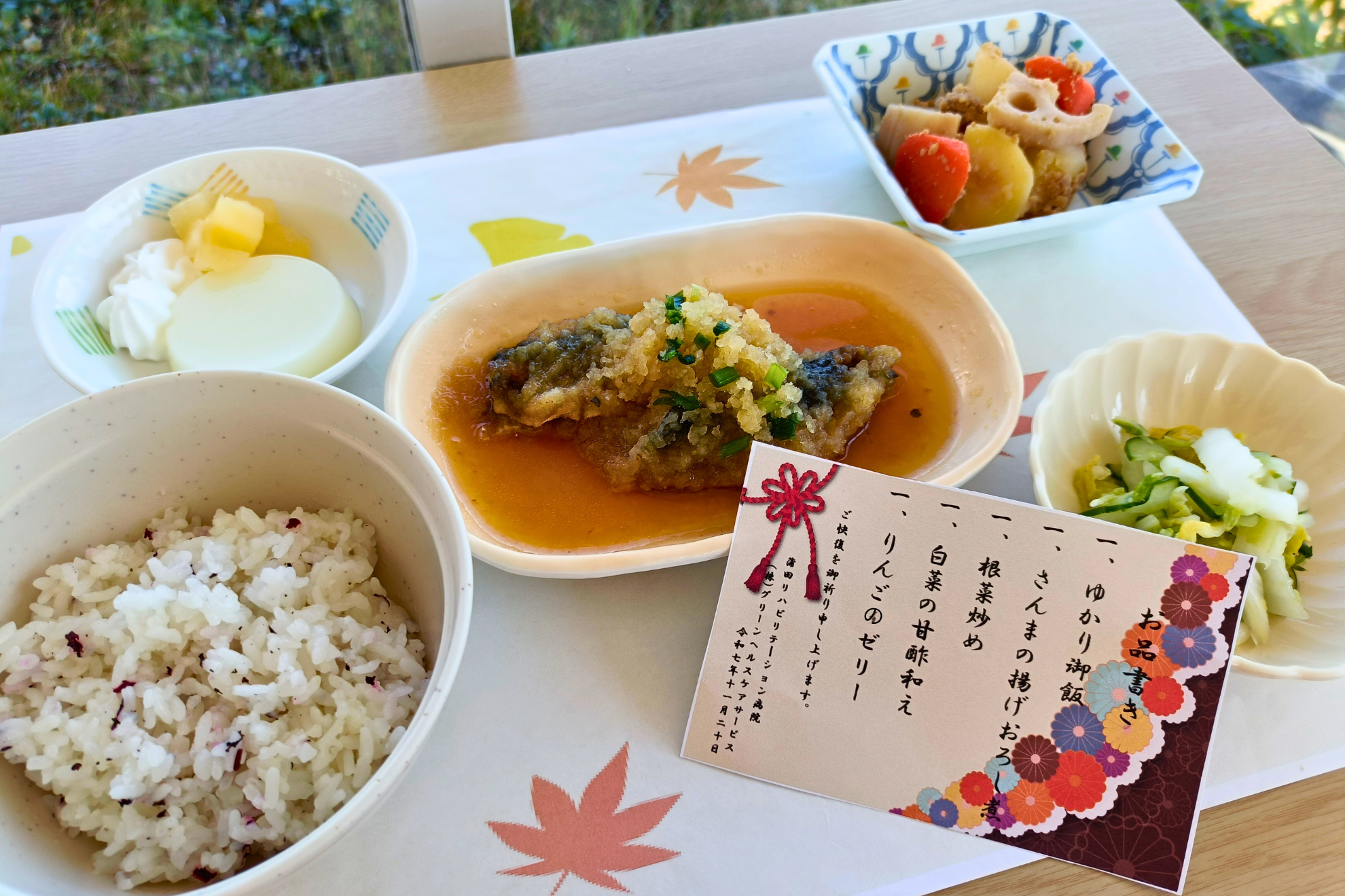 HOME お知らせ一覧 11月の行事食 2025.12.16 その他 11月の行事食 11月の行事食は・・・ ●ゆかりご飯 ●さんまの揚げおろし煮 ●根菜炒め ●白菜の甘酢和え ●りんごのゼリー 旬の食材であるさんまやレンコンを使用し、見た目にも味わいにも季節感を感じる内容となりました。 さんまは脂がのっており、患者様からは「秋を感じられて嬉しい」「とても美味しかった」といったお声をいただき、大変好評でした。 お知らせ一覧へ 相談窓口 入院案内